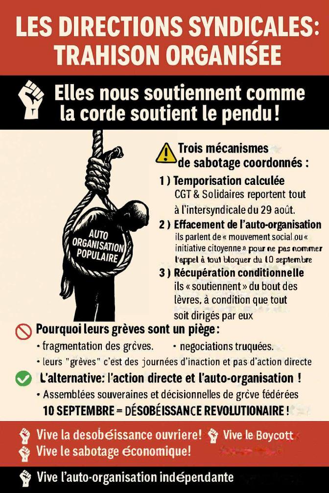 L’analyse des communiqués de la CGT (27 août) et de Solidaires révèle un fait politique majeur : malgré leurs nuances, ces deux appareils appliquent la même stratégie de sabotage de l’auto-organisation née de l’appel à tout bloquer le 10 septembre.