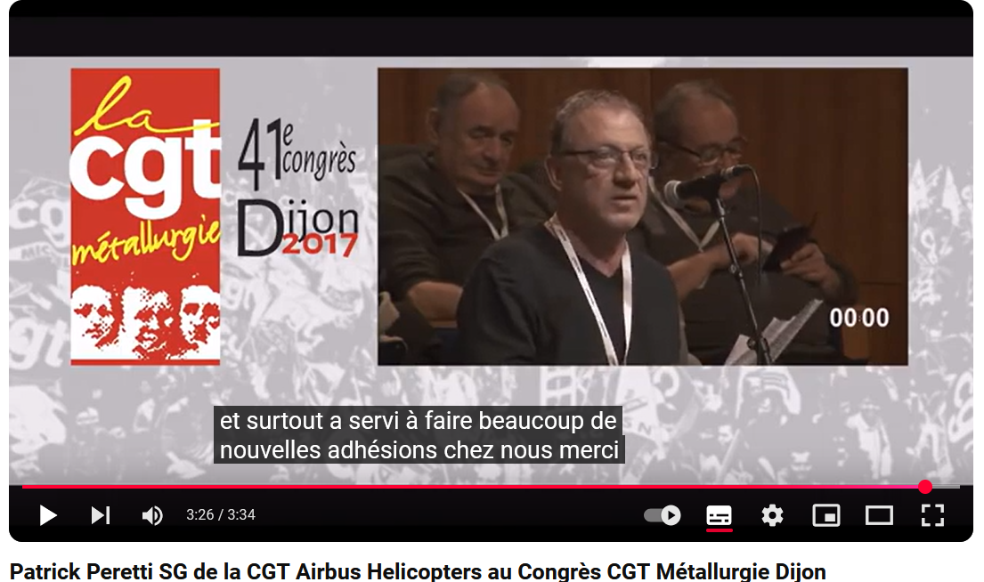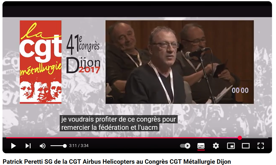 Que voyons-nous sur cet extrait du Congrès CGT métallurgie ? Oui, un certain Patrick Peretti, larbin local de cette Fédération Métallurgie, qui remercie ses chefs en plein congrès ! Cette Fédération Métallurgie qui rappelons-le, exclut J-P Mercier, le porte-parole de LO qui à cette occasion dénonça les "Bureaucrates de Montreuil". Bref, Patrick Peretti est un jaune syndical, un ami stalinien de la CGT 13.