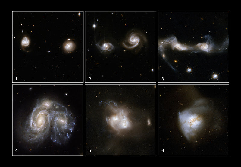Récemment, un grand nombre d’initiatives ont convergé pour tenter de comprendre les évènements de fusion dans l’évolution des galaxies. Notre propre galaxie, la Voie lactée a une faible galaxie satellite (la Galaxie naine elliptique du Sagittaire), actuellement en cours de dépeçage et d’absorption par la Voie lactée. On pense que ce genre d’évènement est relativement courant dans l’évolution des grandes galaxies. La Galaxie Naine du Sagittaire orbite autour de la nôtre pratiquement à angle droit par rapport au disque. Elle traverse actuellement ce disque ; des étoiles des deux galaxies sont en train d’en être arrachées à chaque passage, et elles rejoignent le halo de notre galaxie. Il existe d’autres exemples de ces évènements mineurs d’accrétion, et c’est vraisemblablement un processus continu pour de nombreuses galaxies. Des preuves de ce processus sont souvent observés sous la forme de bandes ou de courants d’étoiles s’extrayant des galaxies.