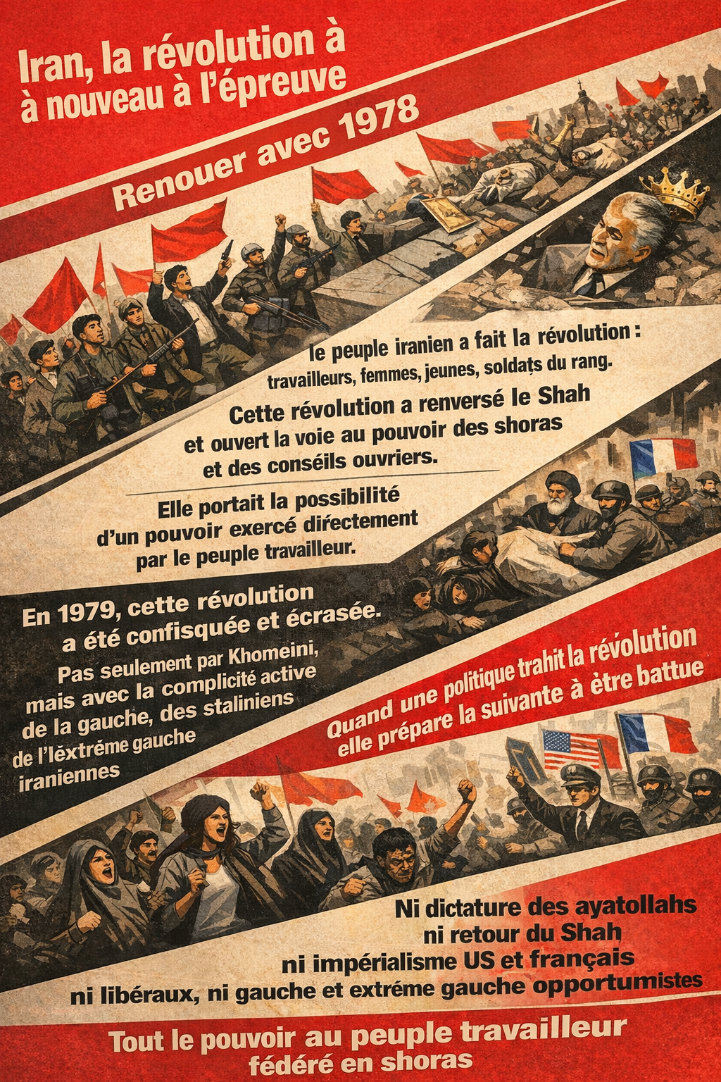 Iran : ni guide suprême, ni chefs religieux au pouvoir, ni monarque, ni représentants de l’impérialisme, ni proches de Nétanyahou ou de Trump au gouvernement, ni profiteurs, ni exploiteurs, ni oppresseurs des femmes, juste le pouvoir du peuple travailleur !