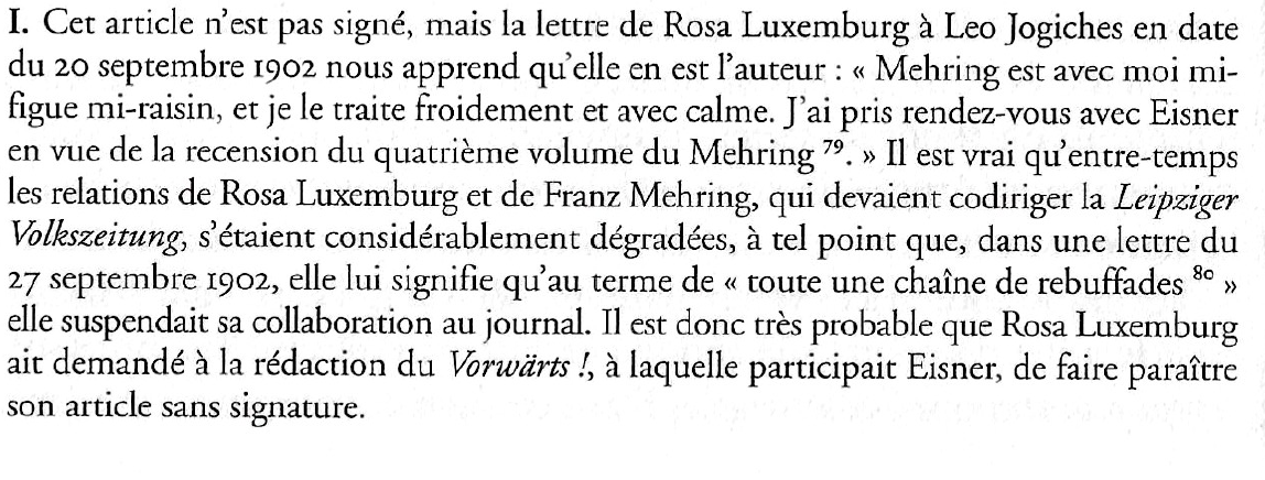 Ou alors la note [79] renvoie justement à ce catalogue ? Mais le professionnel, avant même de se référer à cette "note dans une note", procédé très peu amical pour le lecteur, a un doute, car nos spécialistes citent Rosa Luxemburg qui mentionne "le quatrième volume de Mehring". Or si l’on revient au tout début de l’article de Rosa Luxemburg, on voit que Rosa Luxemburg traite des "Oeuvres complètes volumes II et III" de Marx, du "troisième volume" de Mehring, pas d’un quelconque "quatrième volume". Donc la citation de Rosa Luxemburg ne semble pas pouvoir être prise comme "certificat de paternité" pour cet article du 9 novembre 1902 ! Nos "spécialistes" ne mentionnent pas cette contradiction.