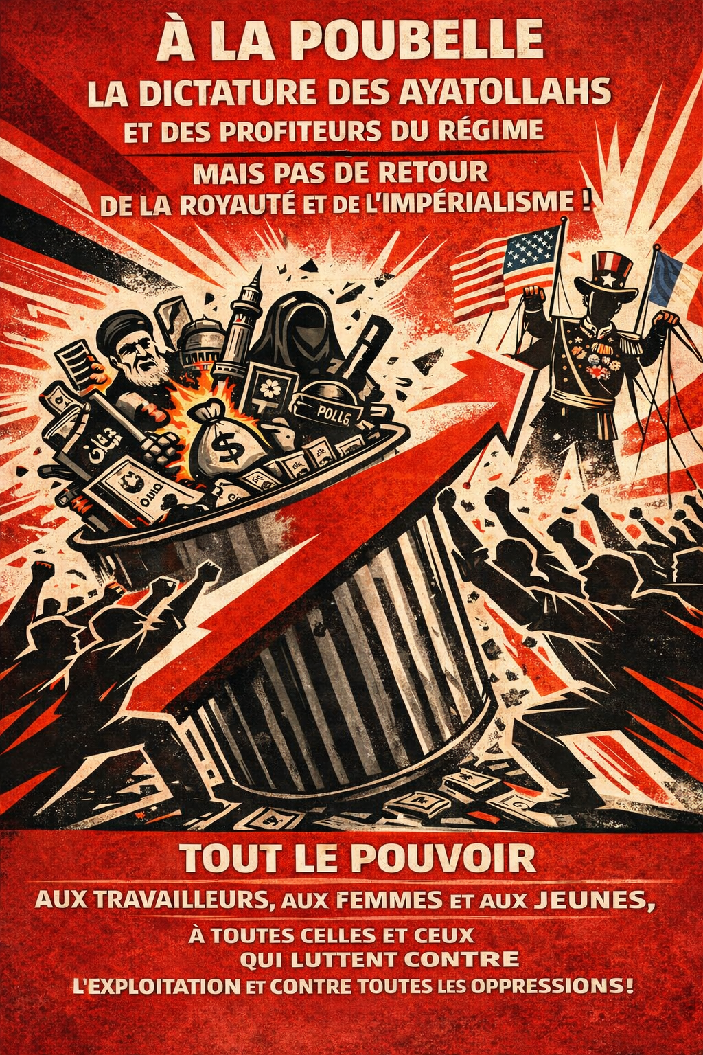 Au diable, en enfer, à la poubelle la dictature des ayatollahs et des profiteurs du régime, NON au retour de la royauté, ni du féodalisme, ni de l’impérialisme, pas de victoire ni d’influence de Nétanyahou, ni de Trump en Iran !