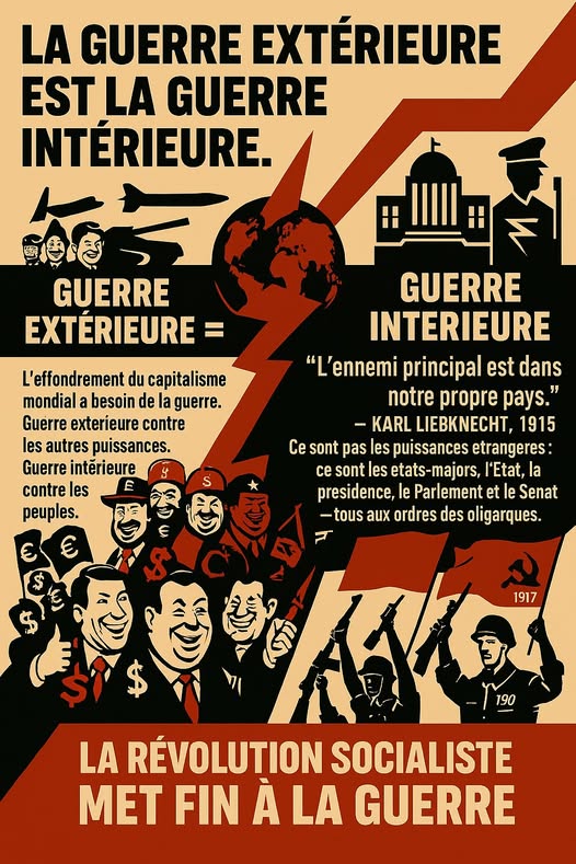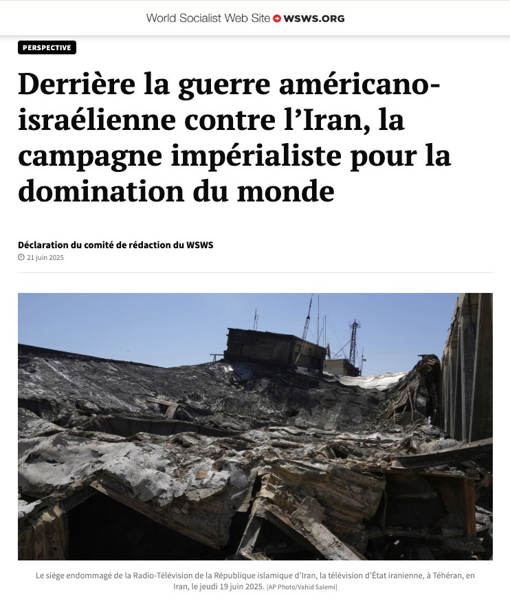 La guerre actuelle ne concerne pas seulement l’Iran, pas seulement le Moyen-Orient mais toute la planète, tous les peuples et, particulièrement, tous les travailleurs ! Il importe d’abord qu’ils en prennent conscience, qu’ils discutent entre eux, qu’ils comprennent que l’enjeu n’est pas seulement l’Iran mais la pérennité des impérialismes. Ils sont considérablement affaiblis du moment qu’ils entrent en guerre. C’est le moment non pas de se solidariser avec eux mais de tout faire pour les déstabiliser. Les travailleurs du monde ont comme premier intérêt de renverser l’impérialisme. La guerre actuelle, qui va de l’Ukraine à Gaza en passant par l’Iran et l’Afghanistan, le Yémen et le Liban, Israël et le Pakistan, la Syrie et les USA ainsi que les autres impérialismes occidentaux comme la France, ne doit pas être perdue comme occasion d’affaiblir, de discréditer, de combattre l’impérialisme. Partout, dans les entreprises, doit retentir le cri de guerre du prolétariat révolutionnaire :