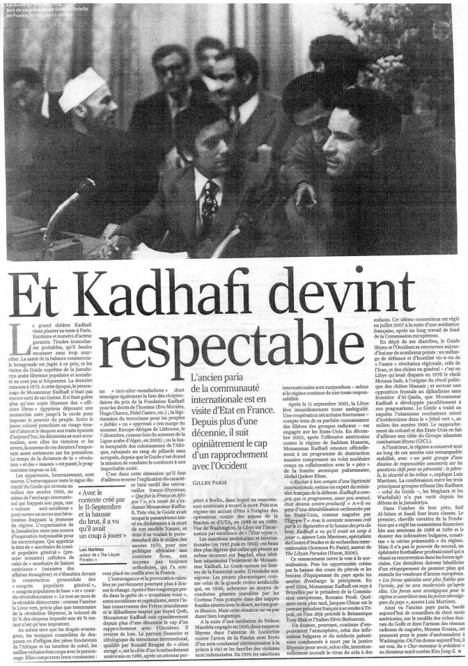 – décembre 2007 : La France déroule le tapis rouge devant Kadhafi à Paris.