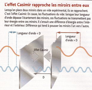 ●[L’effet fut prédit en 1948 par le chercheur hollandais HENDRIK Casimir : : 2 miroirs parallèles et placés dans le vide s’attirent faiblement. Très faiblement : : pour des miroirs de 1 cm2, espacés de 0,5 micromètre, la force d’attraction correspond au poids d’une masse de 0,2 milligramme. Il n’empêche que l’effet Casimir a été vérifié dès 1958 par un autre physicien hollandais, Marcus SPARNAAY, qui a pu mettre en évidence à la fois l’existence de la force d’attraction et sa dépendance vis-à-vis de l’écart entre les plaques.]