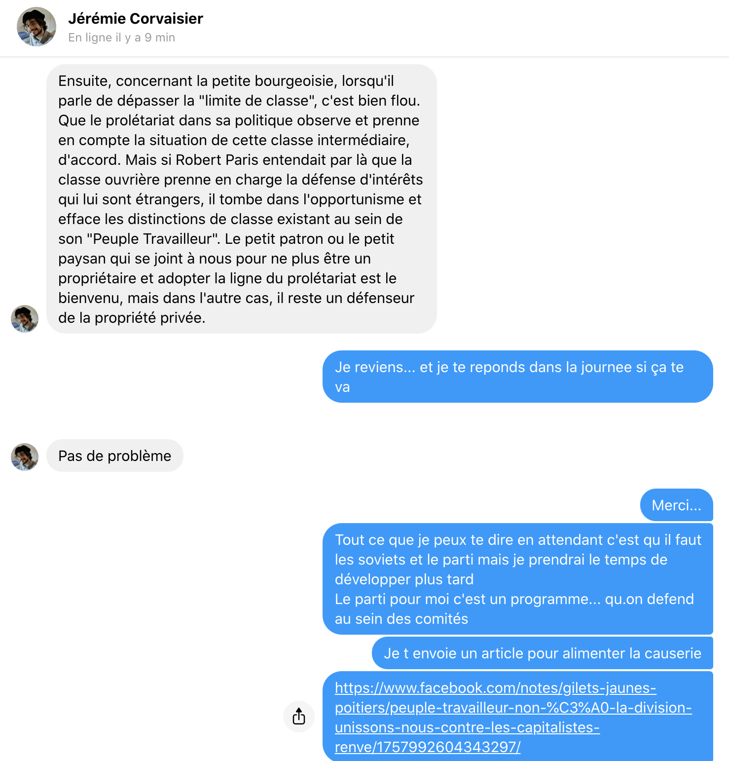 4. Des échos d’un débat entre révolutionnaires au sein des gilets jaunes sur la page de gilets jaunes Poitiers à propos des comités de travailleurs, de l’auto-organisation, du parti révolutionnaire et aussi de la petite bourgeoisie, 20 juillet 2020, 14:18, par Robert Paris