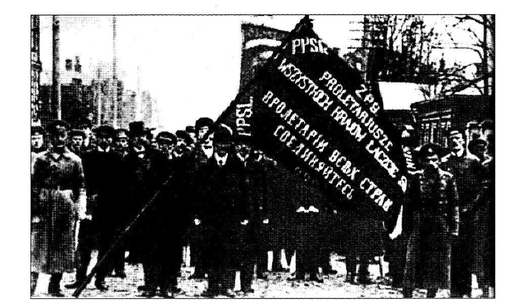 A Kazan (Russie) en mars 1917, des militants du Parti Socialiste Polonais - gauche (PPS-L sur le drapeau) manifestent. Sur le drapeau on lit « Prolétaires de tous les pays, unissez-vous ! » en russe et en polonais. Le PPS-L et la SDKPiL, en 1918, fusionneront pour former le Parti communiste polonais)